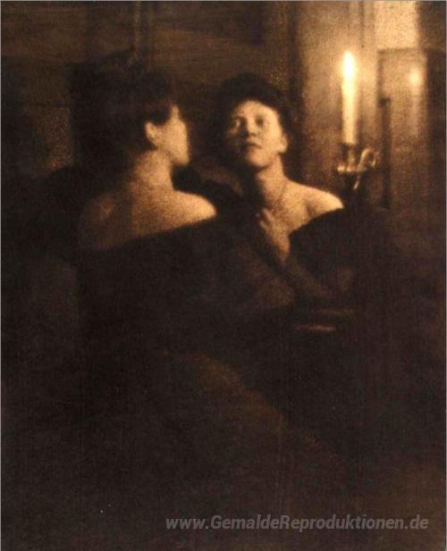 Wir bieten Ihnen eine handgefertigte Reproduktion auf Leinwand des berühmten Kunstwerks 'Frau an einem Spiegel' von Heinrich Kuhn, aus dem Reproduktionsmuseum.