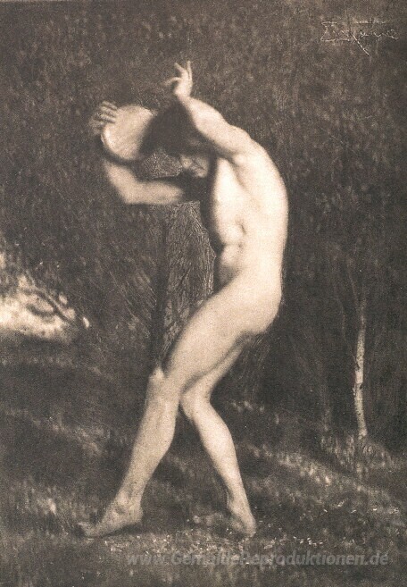 Wir bieten Ihnen eine handgefertigte Reproduktion auf Leinwand des berühmten Kunstwerks 'Male Nude' von Frank Eugene, aus dem Reproduktionsmuseum.