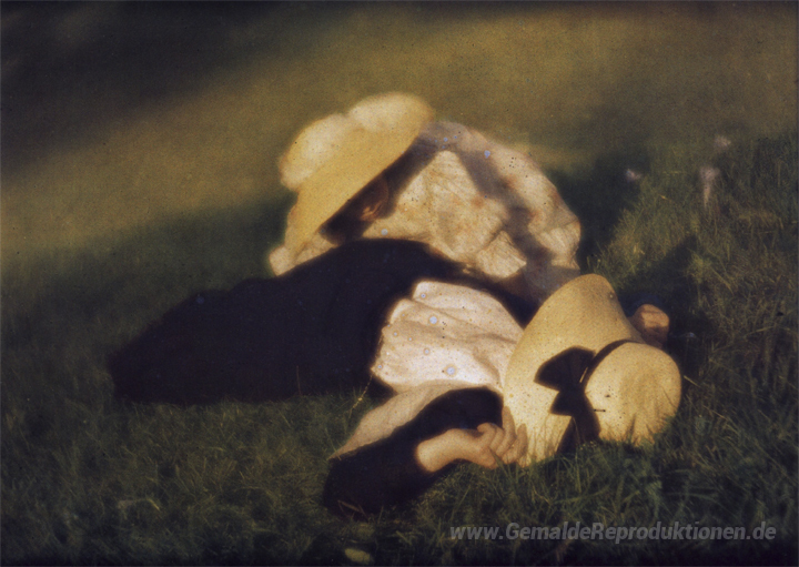 Wir bieten Ihnen eine handgefertigte Reproduktion auf Leinwand des berühmten Kunstwerks 'Miss Mary und Edeltrude im Gras liegen' von Heinrich Kuhn, aus dem Reproduktionsmuseum.