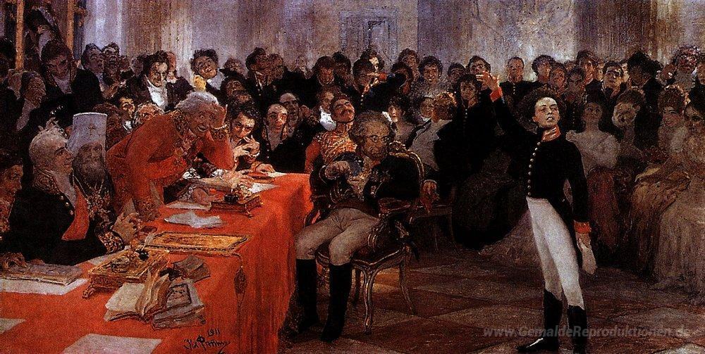 Wir bieten Ihnen eine handgefertigte Reproduktion auf Leinwand des berühmten Kunstwerks 'A. Puschkin auf den Akt im Lyceum am 8. Januar 1815 liest sein G' von Ilya Repin, aus dem Reproduktionsmuseum.
