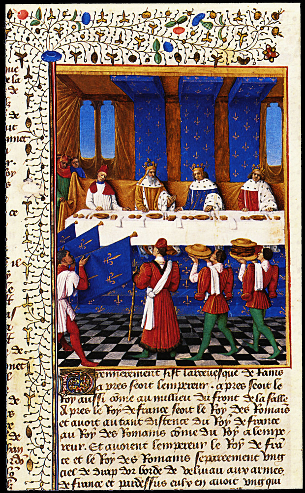 Wir bieten Ihnen eine handgefertigte Reproduktion auf Leinwand des berühmten Kunstwerks 'Bankett von Charles V (1338-1380) in Hhonour seines Onkels Kaise' von Jean Fouquet, aus dem Reproduktionsmuseum.