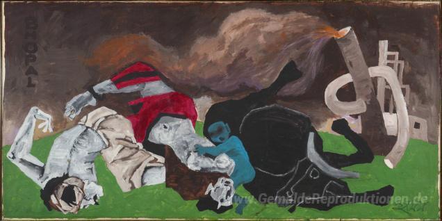 Wir bieten Ihnen eine handgefertigte Reproduktion auf Leinwand des berühmten Kunstwerks 'Bhopal' von M.F. Husain, aus dem Reproduktionsmuseum.
