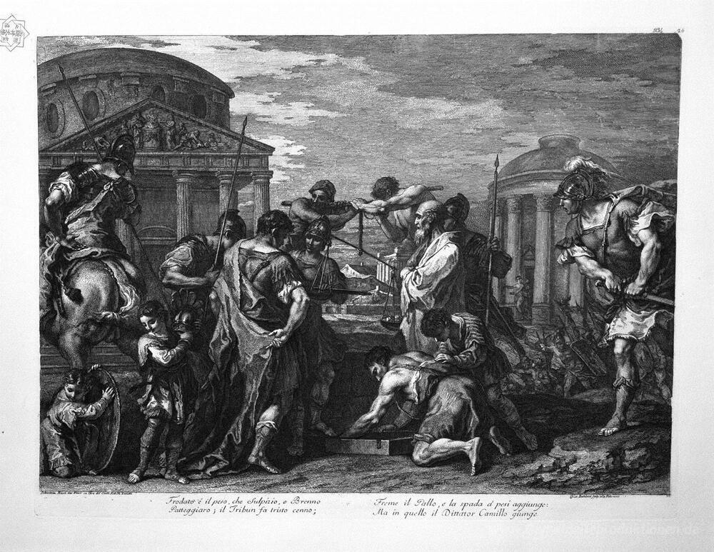 Wir bieten Ihnen eine handgefertigte Reproduktion auf Leinwand des berühmten Kunstwerks 'Brennus und Camillus' von Giovanni Battista Piranesi, aus dem Reproduktionsmuseum.