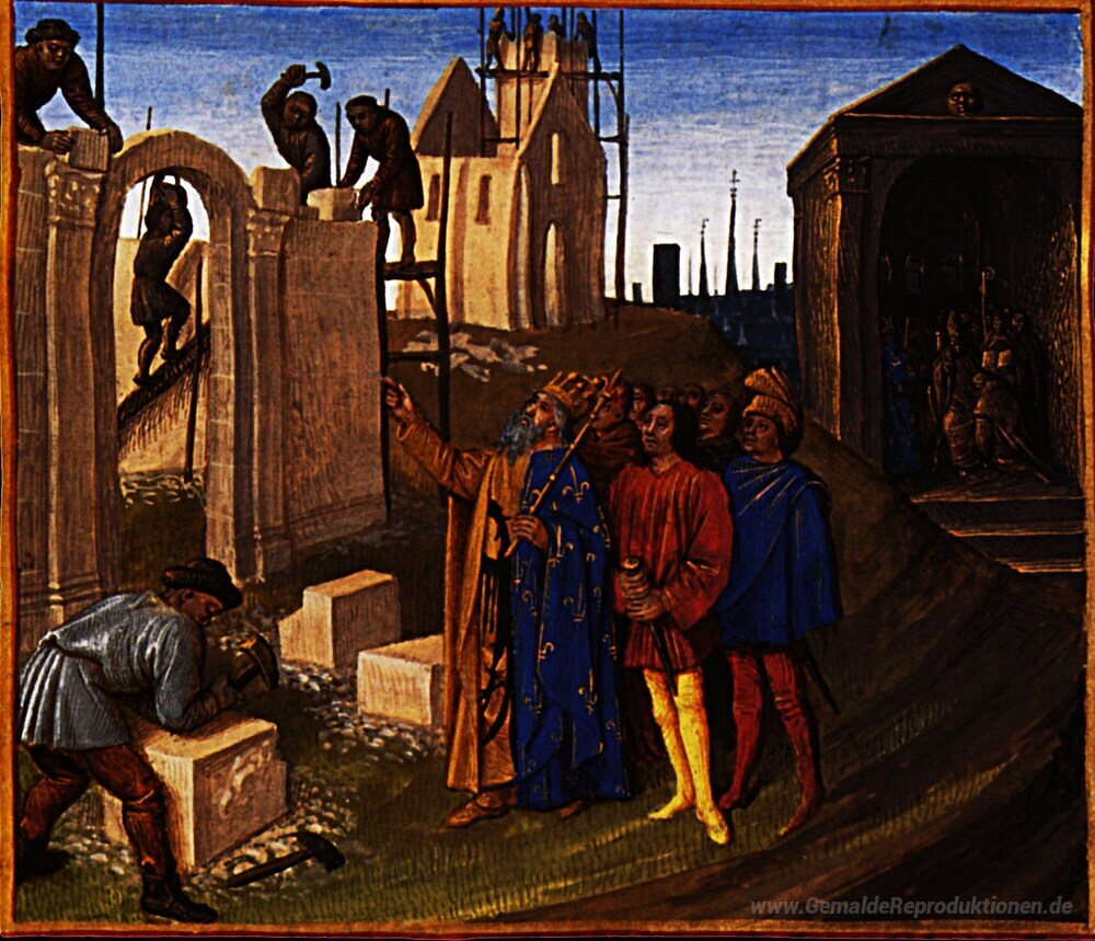 Wir bieten Ihnen eine handgefertigte Reproduktion auf Leinwand des berühmten Kunstwerks 'Charlemagne Builder' von Jean Fouquet, aus dem Reproduktionsmuseum.