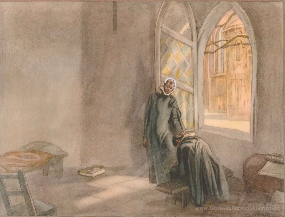 Wir bieten Ihnen eine handgefertigte Reproduktion auf Leinwand des berühmten Kunstwerks 'Das Leben des heiligen Ignatius von Loyola. Platte 4 Ignatius un' von Carlos Saenz de Tejada, aus dem Reproduktionsmuseum.