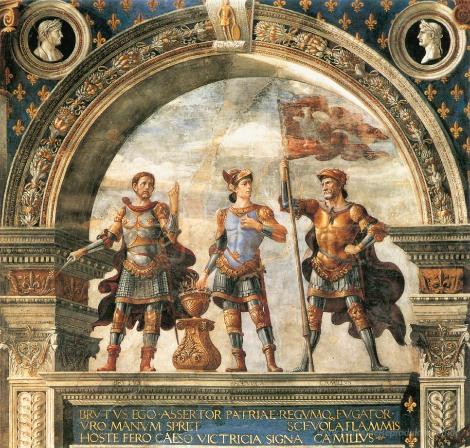 Wir bieten Ihnen eine handgefertigte Reproduktion auf Leinwand des berühmten Kunstwerks 'Dekoration des Sala del Gigli' von Domenico Ghirlandaio, aus dem Reproduktionsmuseum.