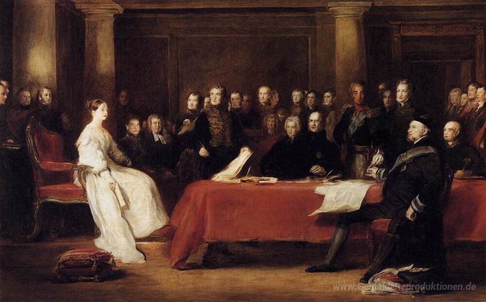 Wir bieten Ihnen eine handgefertigte Reproduktion auf Leinwand des berühmten Kunstwerks 'Der erste Rat von Königin Victoria' von David Wilkie, aus dem Reproduktionsmuseum.