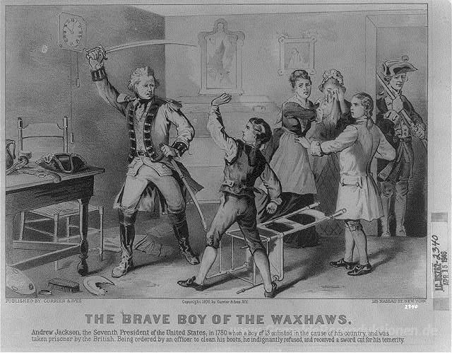 Wir bieten Ihnen eine handgefertigte Reproduktion auf Leinwand des berühmten Kunstwerks 'Der tapfere Junge der Waxhaws' von Currier and Ives, aus dem Reproduktionsmuseum.