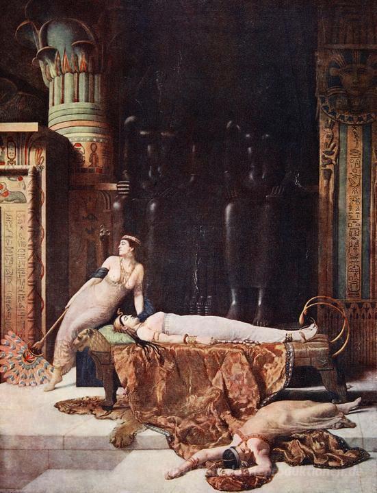 Wir bieten Ihnen eine handgefertigte Reproduktion auf Leinwand des berühmten Kunstwerks 'Der Tod der Kleopatra' von John Collier, aus dem Reproduktionsmuseum.
