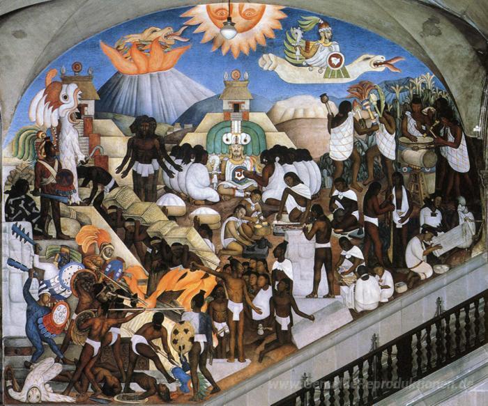 Wir bieten Ihnen eine handgefertigte Reproduktion auf Leinwand des berühmten Kunstwerks 'Die alte indische Welt' von Diego Rivera, aus dem Reproduktionsmuseum.