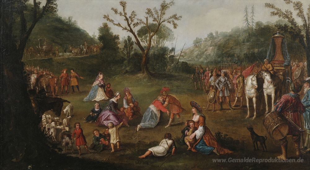Wir bieten Ihnen eine handgefertigte Reproduktion auf Leinwand des berühmten Kunstwerks 'Die Begegnung zwischen Alexander der Große mit der Familie von D' von Esaias van de Velde, aus dem Reproduktionsmuseum.