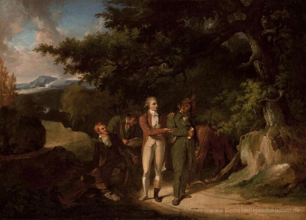 Wir bieten Ihnen eine handgefertigte Reproduktion auf Leinwand des berühmten Kunstwerks 'Die Gefangennahme von Major André' von Thomas Sully, aus dem Reproduktionsmuseum.