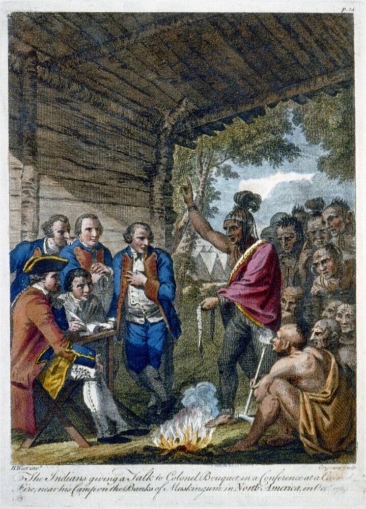 Wir bieten Ihnen eine handgefertigte Reproduktion auf Leinwand des berühmten Kunstwerks 'Die Indianer, die einen Vortrag zum Oberst Bouquet in einer Konf' von Benjamin West, aus dem Reproduktionsmuseum.