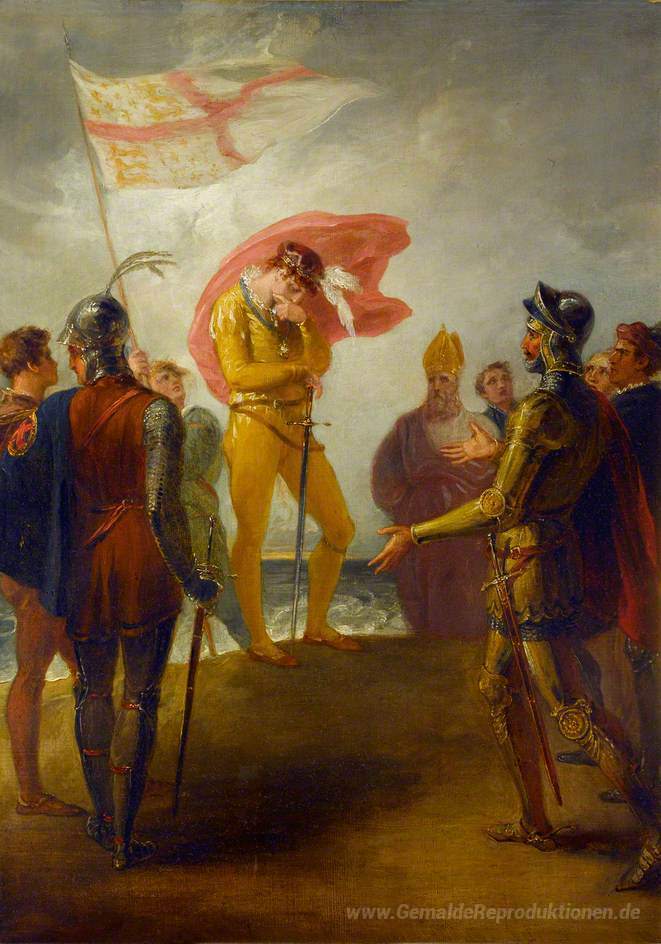 Wir bieten Ihnen eine handgefertigte Reproduktion auf Leinwand des berühmten Kunstwerks 'Die Landung von Richard II bei Milford Haven' von William Hamilton, aus dem Reproduktionsmuseum.