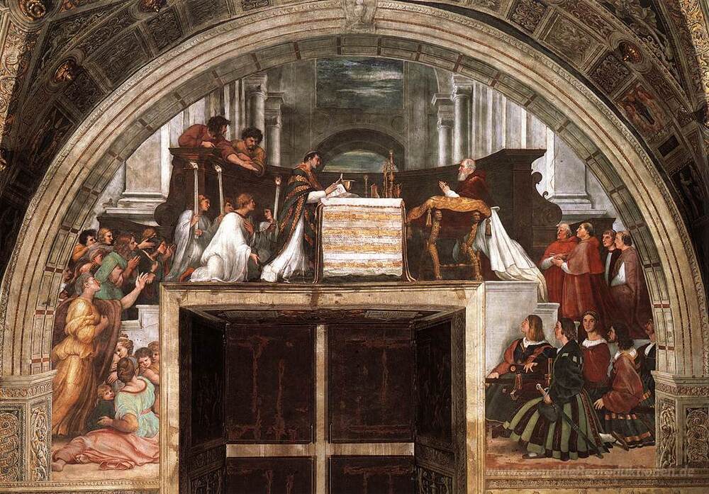 Wir bieten Ihnen eine handgefertigte Reproduktion auf Leinwand des berühmten Kunstwerks 'Die Messe von Bolsena, vom Stanze dell'Eliodor' von Raphael, aus dem Reproduktionsmuseum.