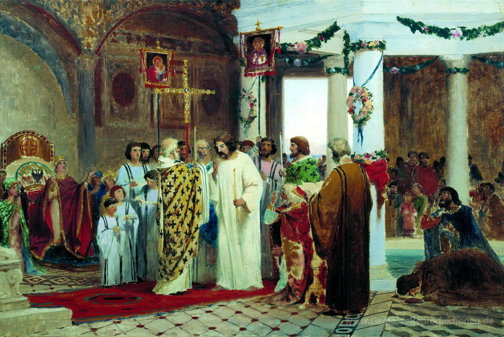 Wir bieten Ihnen eine handgefertigte Reproduktion auf Leinwand des berühmten Kunstwerks 'Die Taufe des Fürsten Wladimir' von Fyodor Bronnikov, aus dem Reproduktionsmuseum.