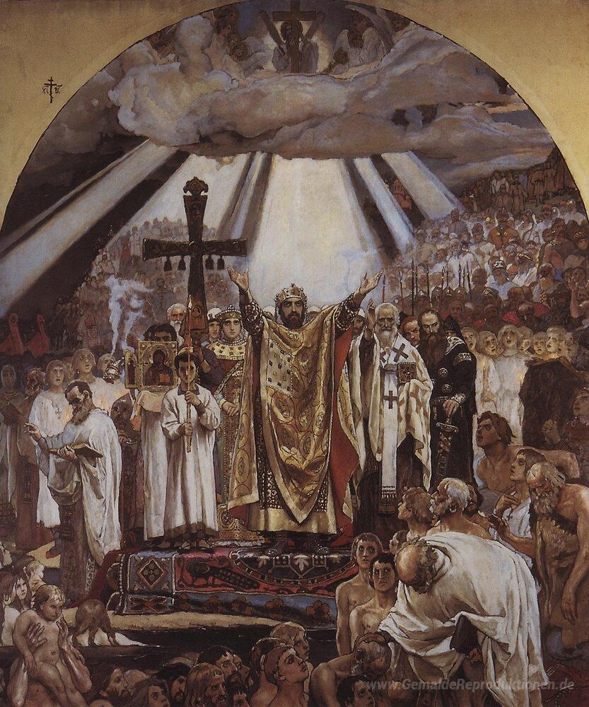 Wir bieten Ihnen eine handgefertigte Reproduktion auf Leinwand des berühmten Kunstwerks 'Die Taufe von Russland' von Viktor Vasnetsov, aus dem Reproduktionsmuseum.
