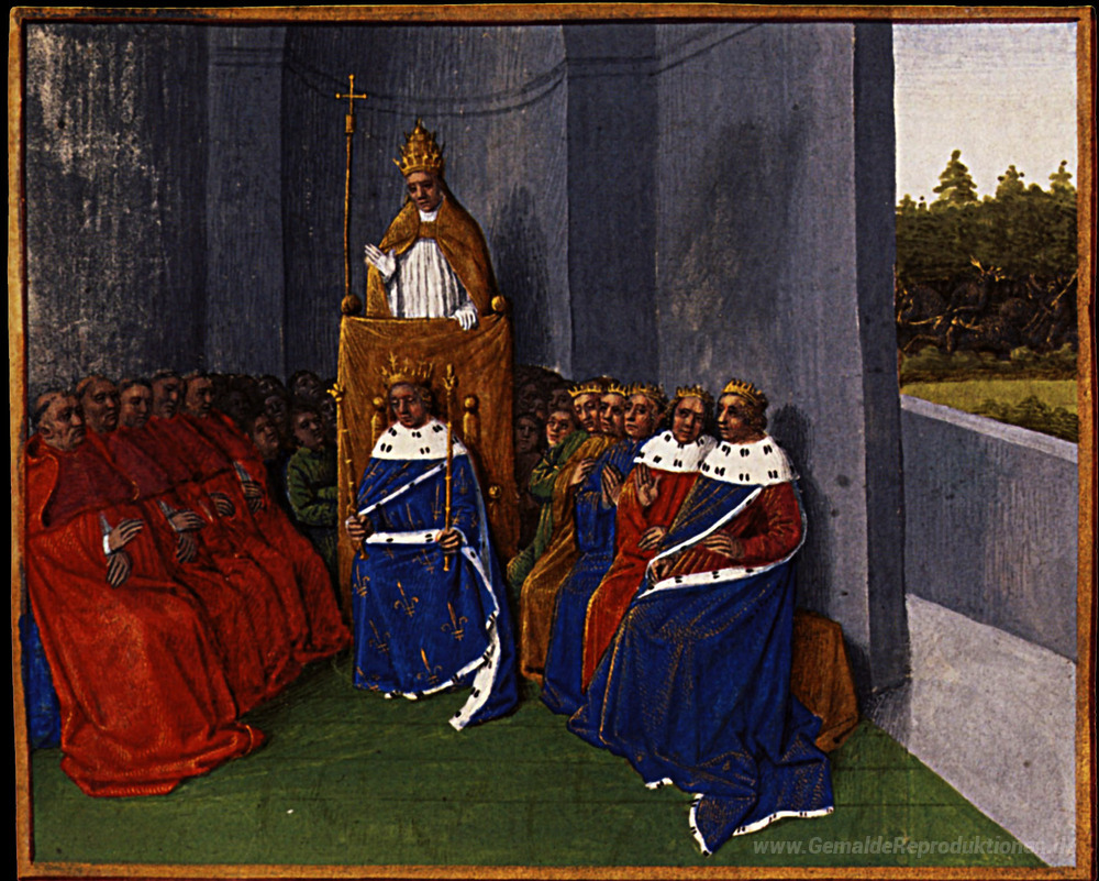 Wir bieten Ihnen eine handgefertigte Reproduktion auf Leinwand des berühmten Kunstwerks 'Die Verkündigung des ersten Kreuzzugs in Clermont' von Jean Fouquet, aus dem Reproduktionsmuseum.
