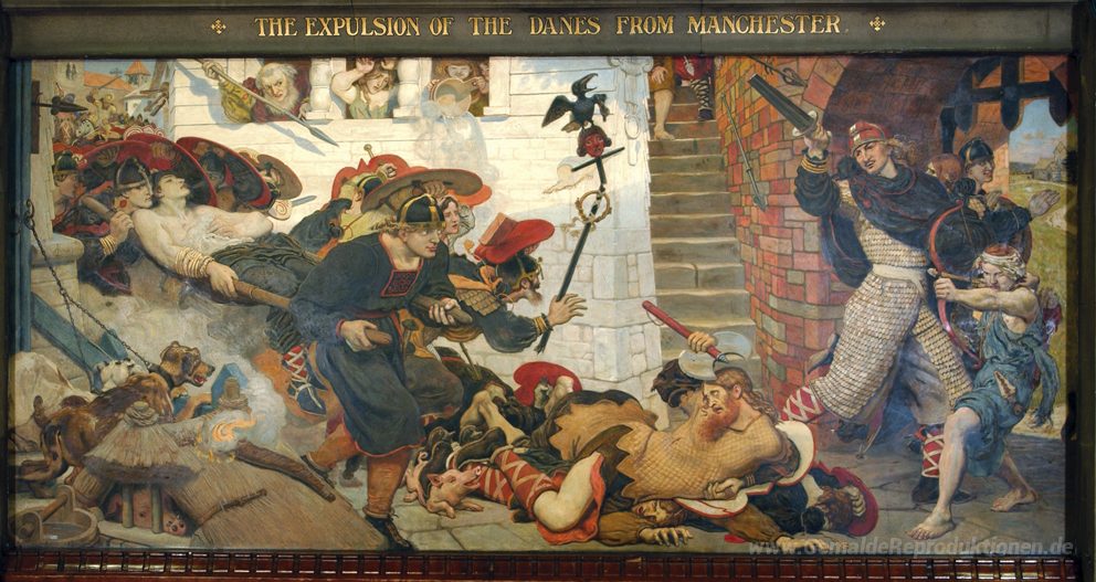 Wir bieten Ihnen eine handgefertigte Reproduktion auf Leinwand des berühmten Kunstwerks 'Die Vertreibung der Dänen von Manchester' von Ford Madox Brown, aus dem Reproduktionsmuseum.