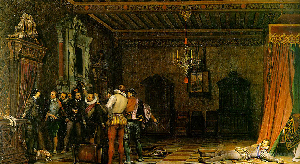 Wir bieten Ihnen eine handgefertigte Reproduktion auf Leinwand des berühmten Kunstwerks 'Ermordung von Heinrich I., Herzog von Guise' von Paul Delaroche, aus dem Reproduktionsmuseum.