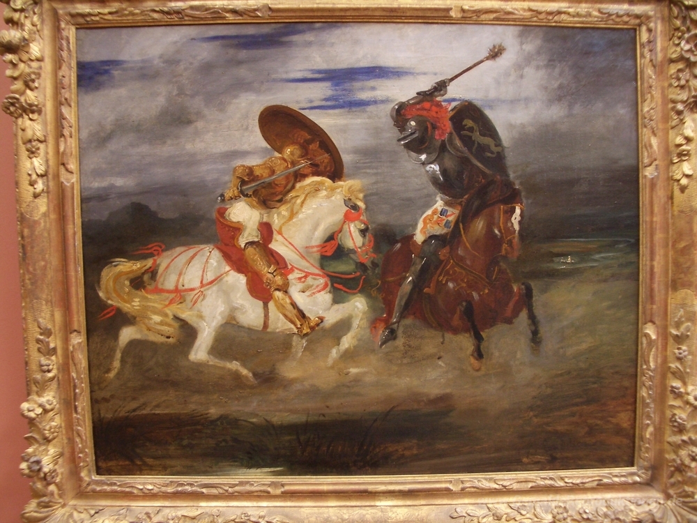 Wir bieten Ihnen eine handgefertigte Reproduktion auf Leinwand des berühmten Kunstwerks 'Gegenüberstellung von Rittern in der Landschaft' von Eugene Delacroix, aus dem Reproduktionsmuseum.