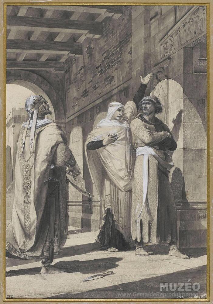 Wir bieten Ihnen eine handgefertigte Reproduktion auf Leinwand des berühmten Kunstwerks 'Girart de Roussillon von seiner Frau Ameline umgewandelt' von Luc-Olivier Merson, aus dem Reproduktionsmuseum.