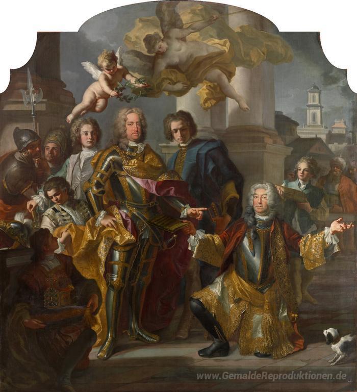 Wir bieten Ihnen eine handgefertigte Reproduktion auf Leinwand des berühmten Kunstwerks 'Gundaker Graf Althann Übergabe an den Kaiser Karl VI (Charles II' von Francesco Solimena, aus dem Reproduktionsmuseum.