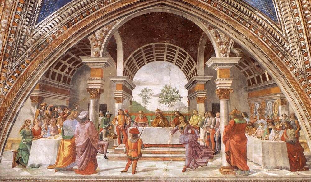 Wir bieten Ihnen eine handgefertigte Reproduktion auf Leinwand des berühmten Kunstwerks 'Herodes und Veranstaltungs' von Domenico Ghirlandaio, aus dem Reproduktionsmuseum.