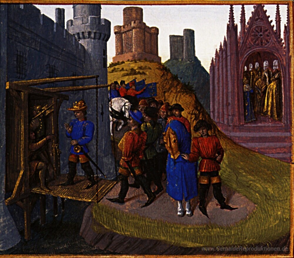 Wir bieten Ihnen eine handgefertigte Reproduktion auf Leinwand des berühmten Kunstwerks 'Hugo Capet ergriff die Festungen Artois' von Jean Fouquet, aus dem Reproduktionsmuseum.