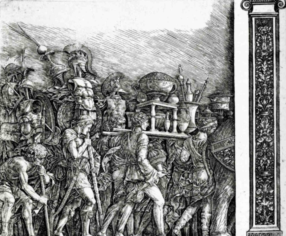 Wir bieten Ihnen eine handgefertigte Reproduktion auf Leinwand des berühmten Kunstwerks 'Inhaber von Währungen und Gold Schmuck, Trophäen königliche Rüst' von Andrea Mantegna, aus dem Reproduktionsmuseum.