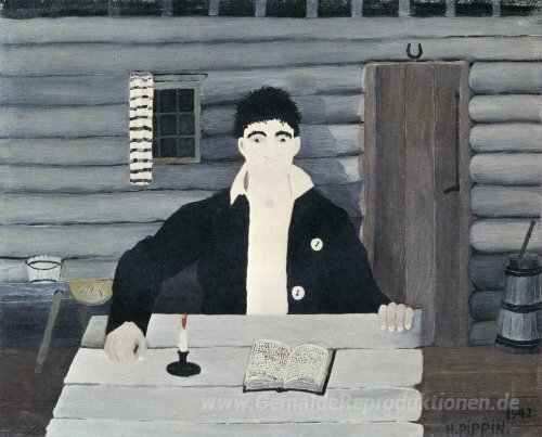 Wir bieten Ihnen eine handgefertigte Reproduktion auf Leinwand des berühmten Kunstwerks 'John Brown Lesen seiner Bibel' von Horace Pippin, aus dem Reproduktionsmuseum.