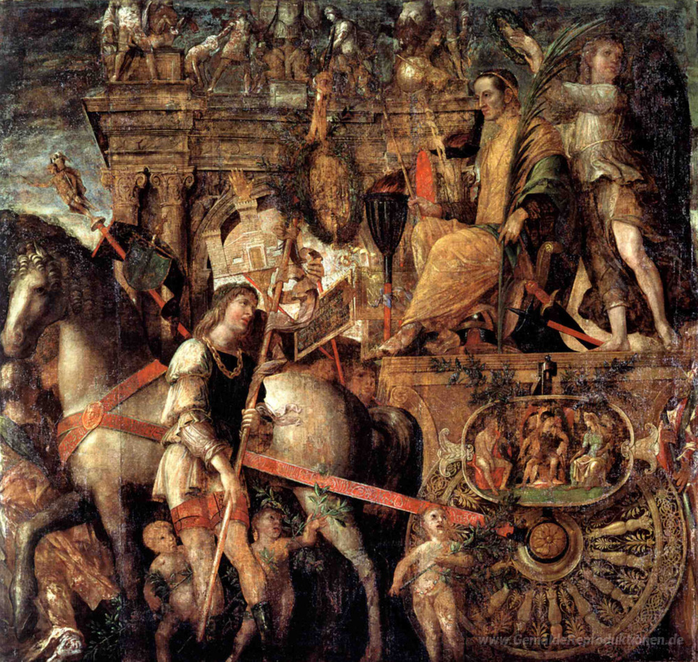 Wir bieten Ihnen eine handgefertigte Reproduktion auf Leinwand des berühmten Kunstwerks 'Julius Caesar auf einem Triumphwagen' von Andrea Mantegna, aus dem Reproduktionsmuseum.