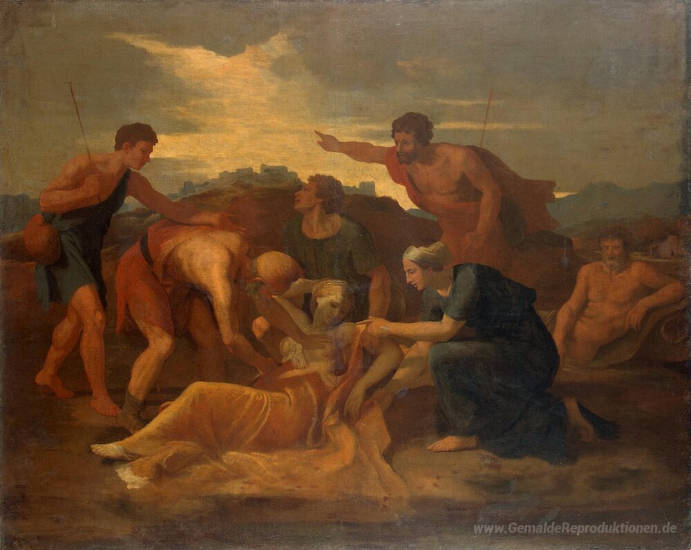 Wir bieten Ihnen eine handgefertigte Reproduktion auf Leinwand des berühmten Kunstwerks 'Königin Zenobia Gefunden auf den Banken des Arax' von Nicolas Poussin, aus dem Reproduktionsmuseum.