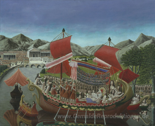 Wir bieten Ihnen eine handgefertigte Reproduktion auf Leinwand des berühmten Kunstwerks 'Kleopatras Barge' von Andre Bauchant, aus dem Reproduktionsmuseum.