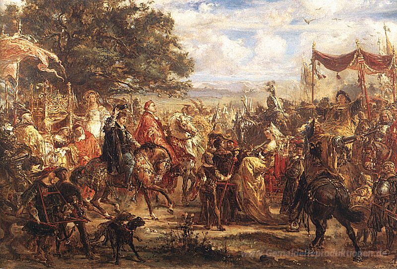 Wir bieten Ihnen eine handgefertigte Reproduktion auf Leinwand des berühmten Kunstwerks 'Kongress der Könige' von Jan Matejko, aus dem Reproduktionsmuseum.