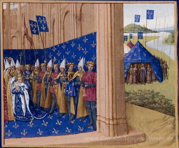 Wir bieten Ihnen eine handgefertigte Reproduktion auf Leinwand des berühmten Kunstwerks 'Krönung von Lothar' von Jean Fouquet, aus dem Reproduktionsmuseum.