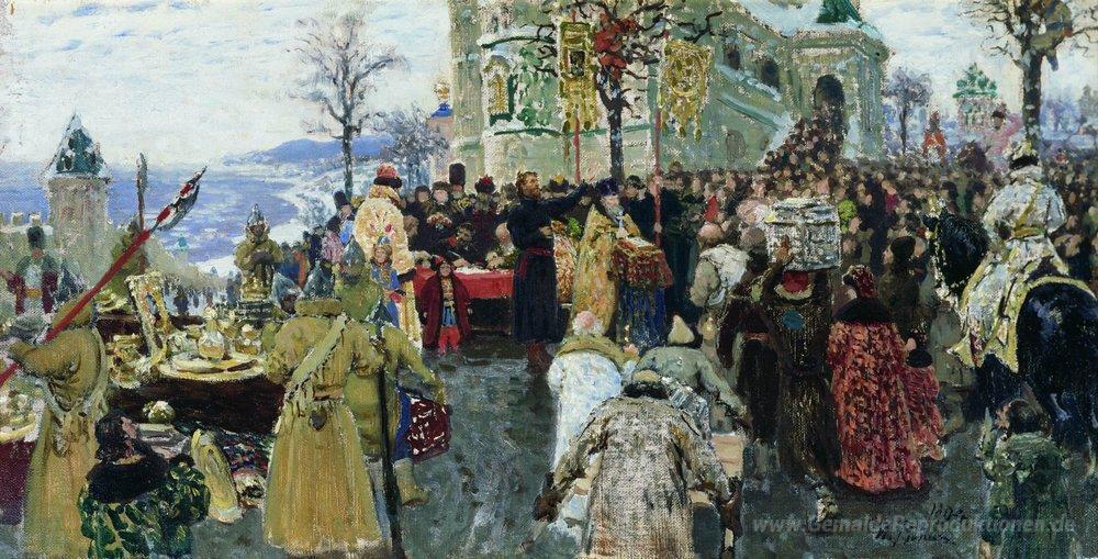 Entdecken Sie die faszinierende Welt der Ölgemälde, in der jedes Werk eine einzigartige Geschichte erzählt. Unter den Meisterwerken des russischen Realismus sticht Ilya Repin hervor, dessen außergewöhnliche Fähigkeit, menschliche Emotionen einzufangen, in seinem Gemälde Kuzma Minin eindrucksvoll zur Geltung kommt. Repin, bekannt für seine Detailtreue und die lebendige Darstellung von Charakteren, bringt mit geschickten Pinselstrichen und einer harmonischen Farbpalette die Atmosphäre des 17. Jahrhunderts zum Leben.