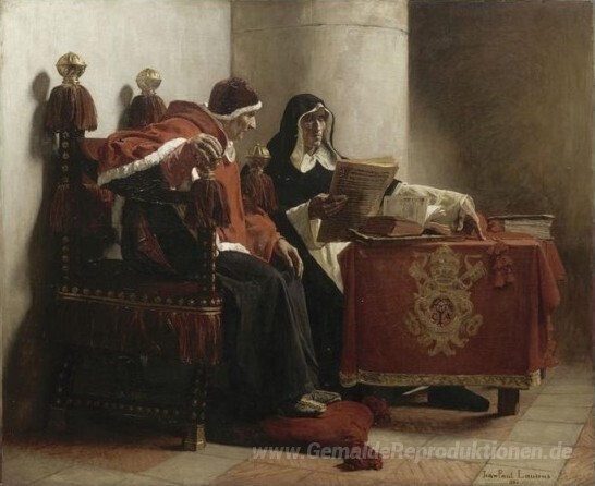 Wir bieten Ihnen eine handgefertigte Reproduktion auf Leinwand des berühmten Kunstwerks 'Le Pape et l'inquisiteur' von Jean-Paul Laurens, aus dem Reproduktionsmuseum.