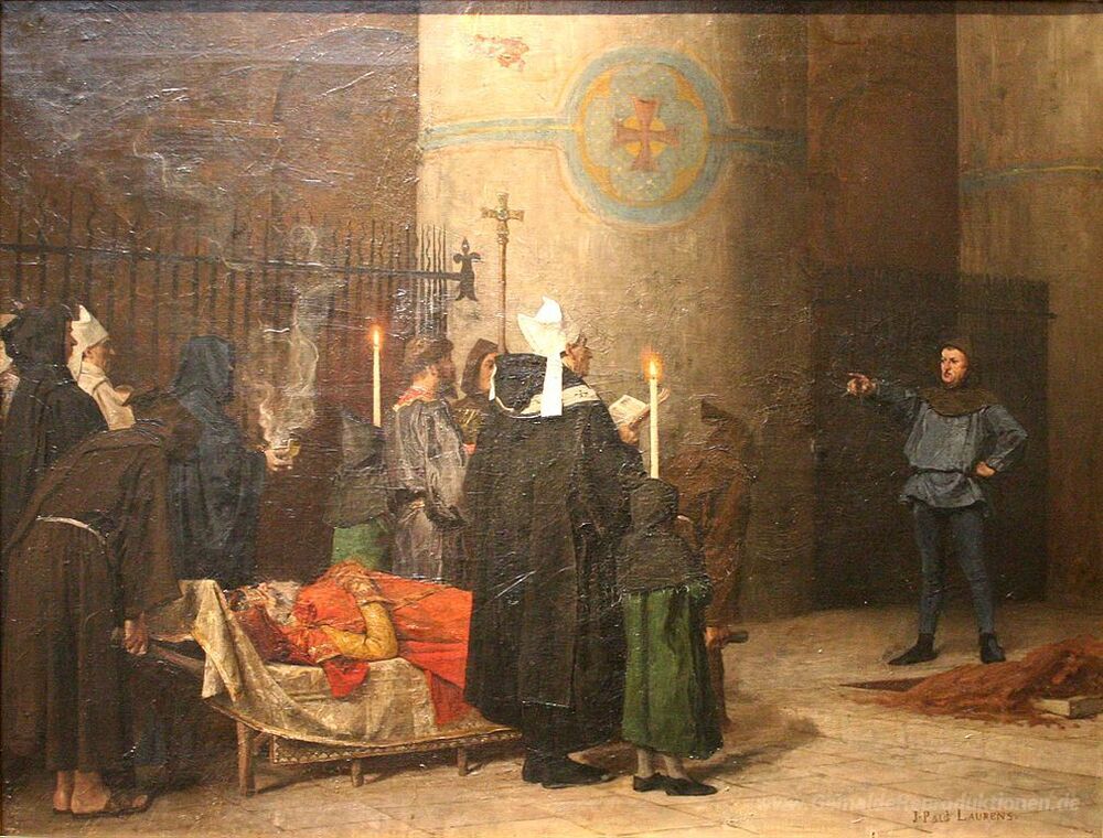 Wir bieten Ihnen eine handgefertigte Reproduktion auf Leinwand des berühmten Kunstwerks 'Les Funérailles de Guillaume le Conquérant' von Jean-Paul Laurens, aus dem Reproduktionsmuseum.