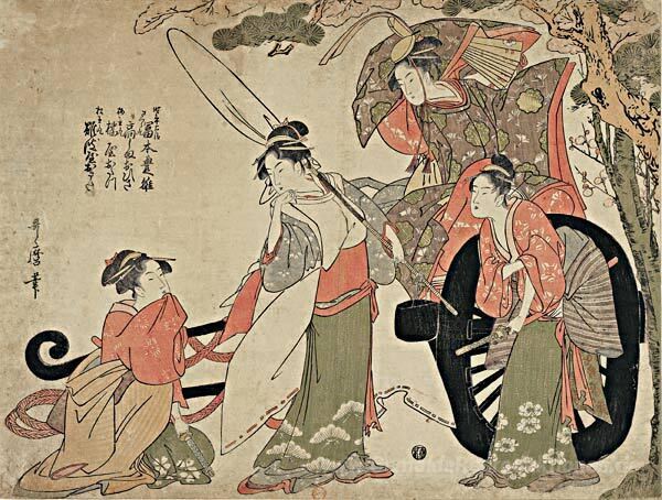 Willkommen in unserer exquisiten Kollektion von Ölgemälden, in der herausragende künstlerische Meisterwerke auf Sie warten. Eines dieser unfassbaren Werke ist Mitate des gebrochenen Wagen, geschaffen von dem berühmten Künstler Kitagawa Utamaro. Utamaro, ein Meister des japanischen Ukiyo-e, kombiniert in seinen Arbeiten harmonische Linienführungen mit subtilen Farbnuancen, die die Betrachter in die gefühlvolle Welt seiner Szenen entführen.