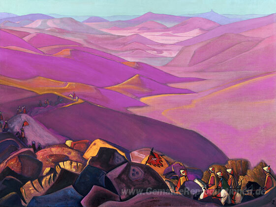Wir bieten Ihnen eine handgefertigte Reproduktion auf Leinwand des berühmten Kunstwerks 'Mongolei (Kampagne von Dschingis Khan)' von Nicholas Roerich, aus dem Reproduktionsmuseum.