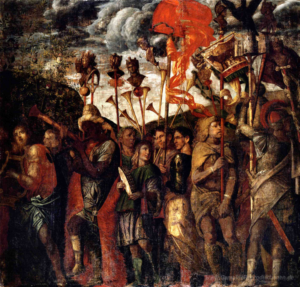 Wir bieten Ihnen eine handgefertigte Reproduktion auf Leinwand des berühmten Kunstwerks 'Musiker und unterrichtet Carriers' von Andrea Mantegna, aus dem Reproduktionsmuseum.