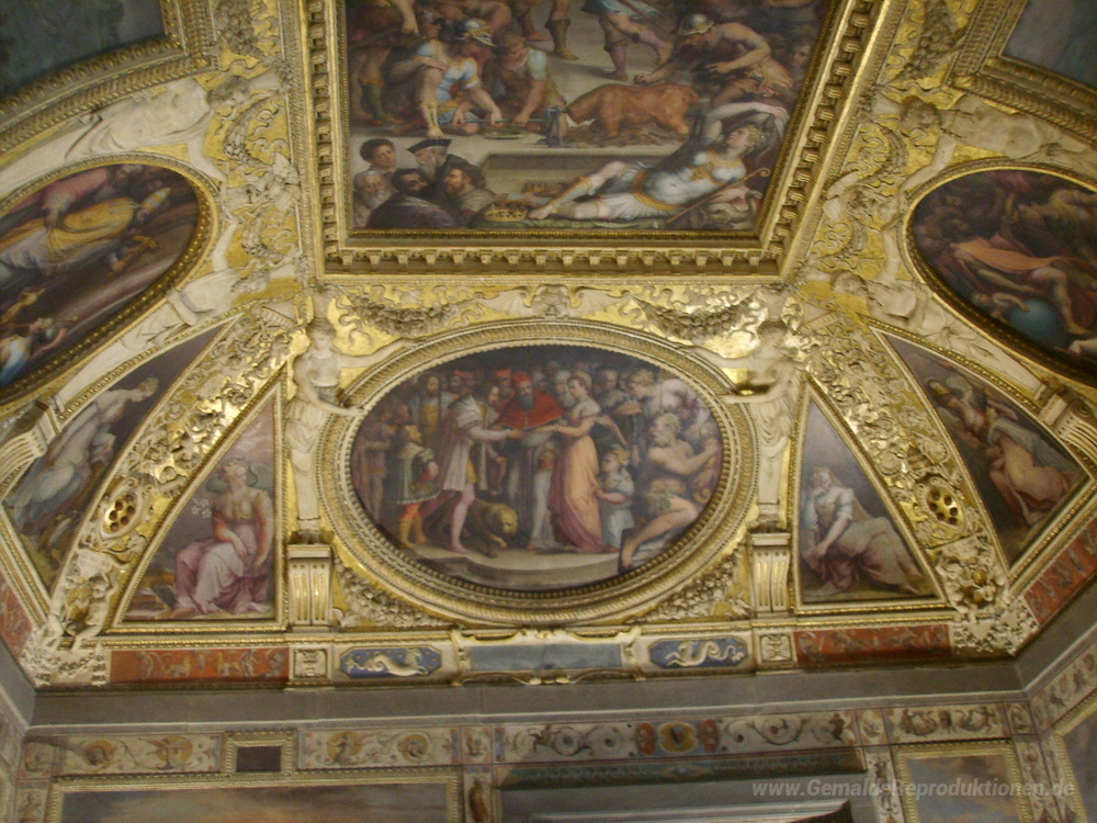Wir bieten Ihnen eine handgefertigte Reproduktion auf Leinwand des berühmten Kunstwerks 'Papst Clemens VII (1478-1534) heiratete Katharina von Medici (15' von Giorgio Vasari, aus dem Reproduktionsmuseum.