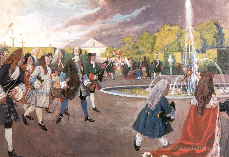 Wir bieten Ihnen eine handgefertigte Reproduktion auf Leinwand des berühmten Kunstwerks 'Peter I auf einem Spaziergang im Sommergarten' von Alexandre Benois, aus dem Reproduktionsmuseum.