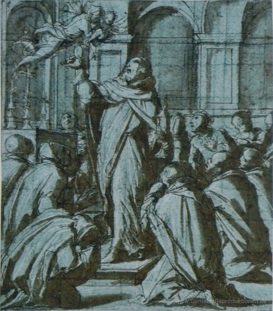 Wir bieten Ihnen eine handgefertigte Reproduktion auf Leinwand des berühmten Kunstwerks 'Peter von Verona exorcising einen Dämon von einer Madonna mit Ki' von Giorgio Vasari, aus dem Reproduktionsmuseum.