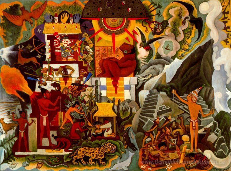 Wir bieten Ihnen eine handgefertigte Reproduktion auf Leinwand des berühmten Kunstwerks 'Pre hispanischen Amerika' von Diego Rivera, aus dem Reproduktionsmuseum.