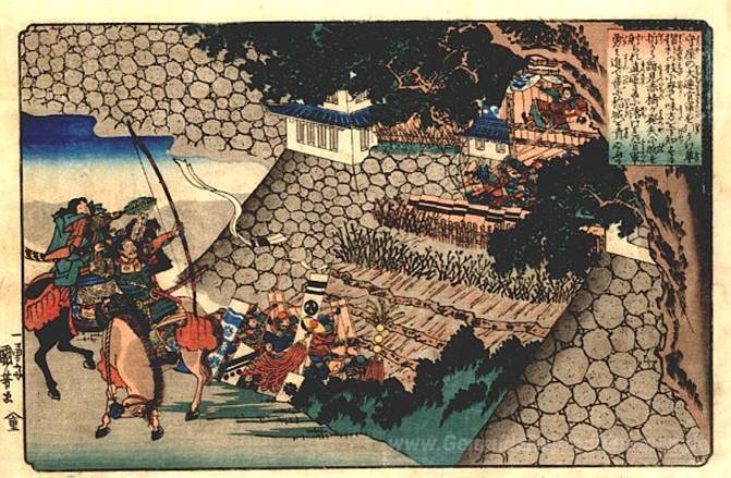 Wir bieten Ihnen eine handgefertigte Reproduktion auf Leinwand des berühmten Kunstwerks 'Prinz Shotoku Richten der Angriff auf Moriya Burg' von Utagawa Kuniyoshi, aus dem Reproduktionsmuseum.