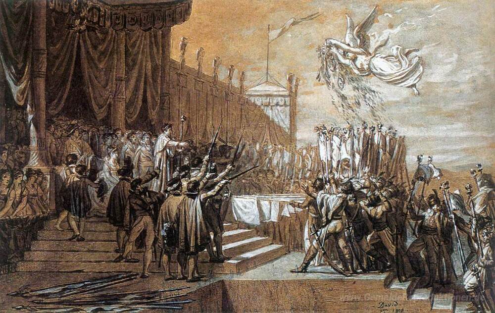 Wir bieten Ihnen eine handgefertigte Reproduktion auf Leinwand des berühmten Kunstwerks 'Studieren Sie für die Verteilung der Eagle-Standards' von Jacques-Louis David, aus dem Reproduktionsmuseum.