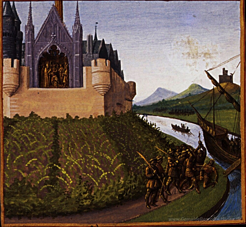 Wir bieten Ihnen eine handgefertigte Reproduktion auf Leinwand des berühmten Kunstwerks 'Tod von William Langschwert' von Jean Fouquet, aus dem Reproduktionsmuseum.