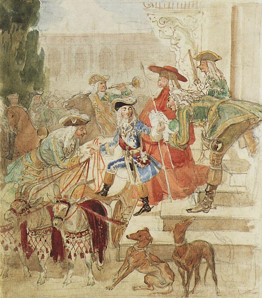 Wir bieten Ihnen eine handgefertigte Reproduktion auf Leinwand des berühmten Kunstwerks 'Walk of Louis XV im Kindesalter' von Karl Bryullov, aus dem Reproduktionsmuseum.